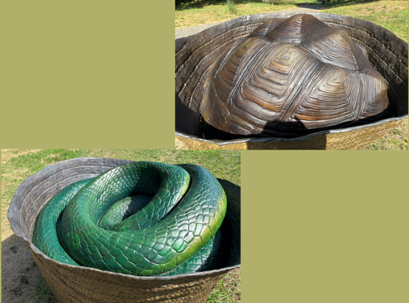 この作品も、ケニアで作られている小さな手工芸品の籠を模して製作された巨大化したブロンズの籠に、古代の存在、神々を象徴するヘビと、美しさや忍耐、共同体を表す亀が入っています。