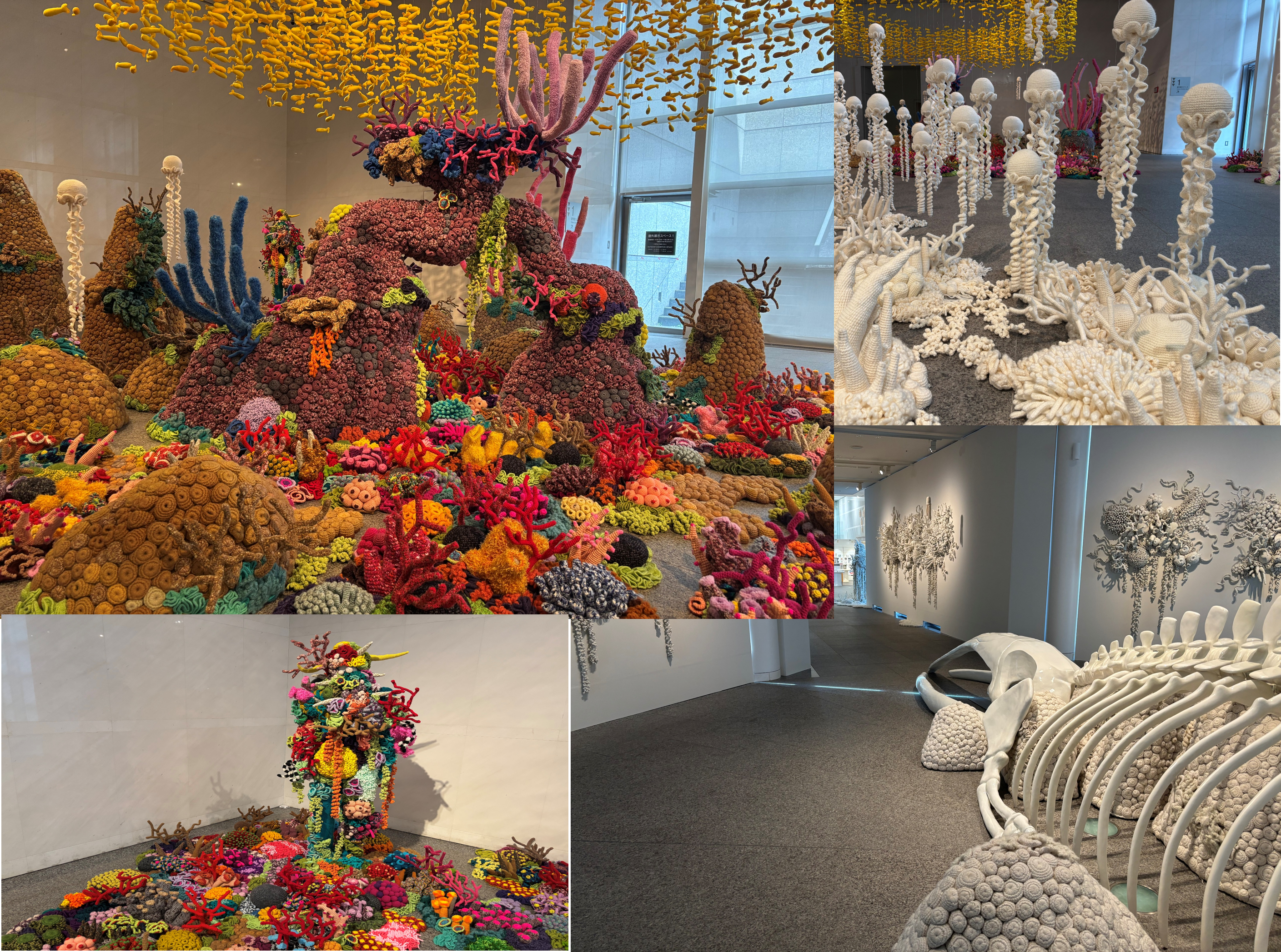 色彩豊かな海の手前には、白化した珊瑚とまっしろなクラゲたち。通路を進むと静かに横たわるクジラの骨。海の中の生と死が共存しています。