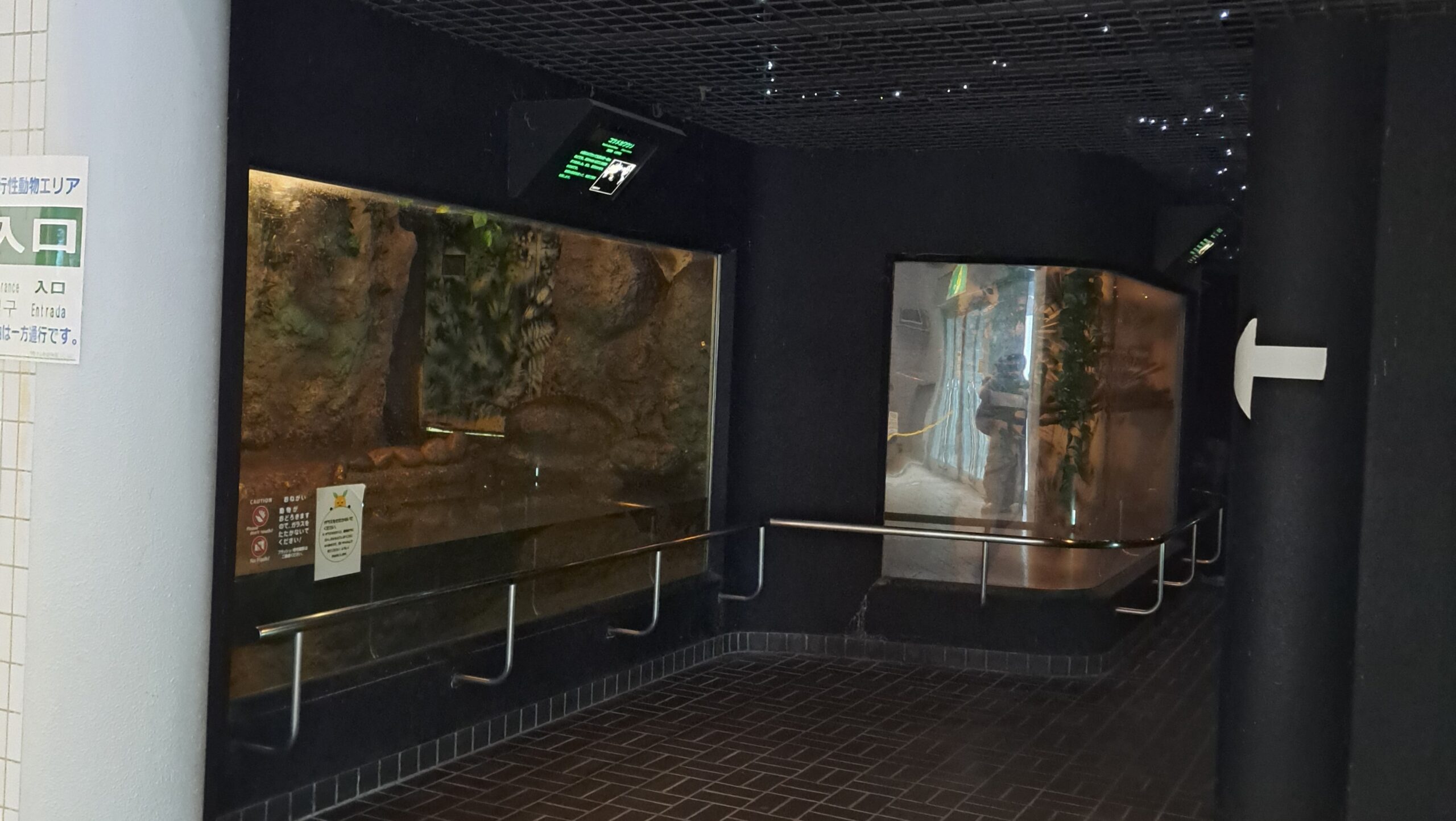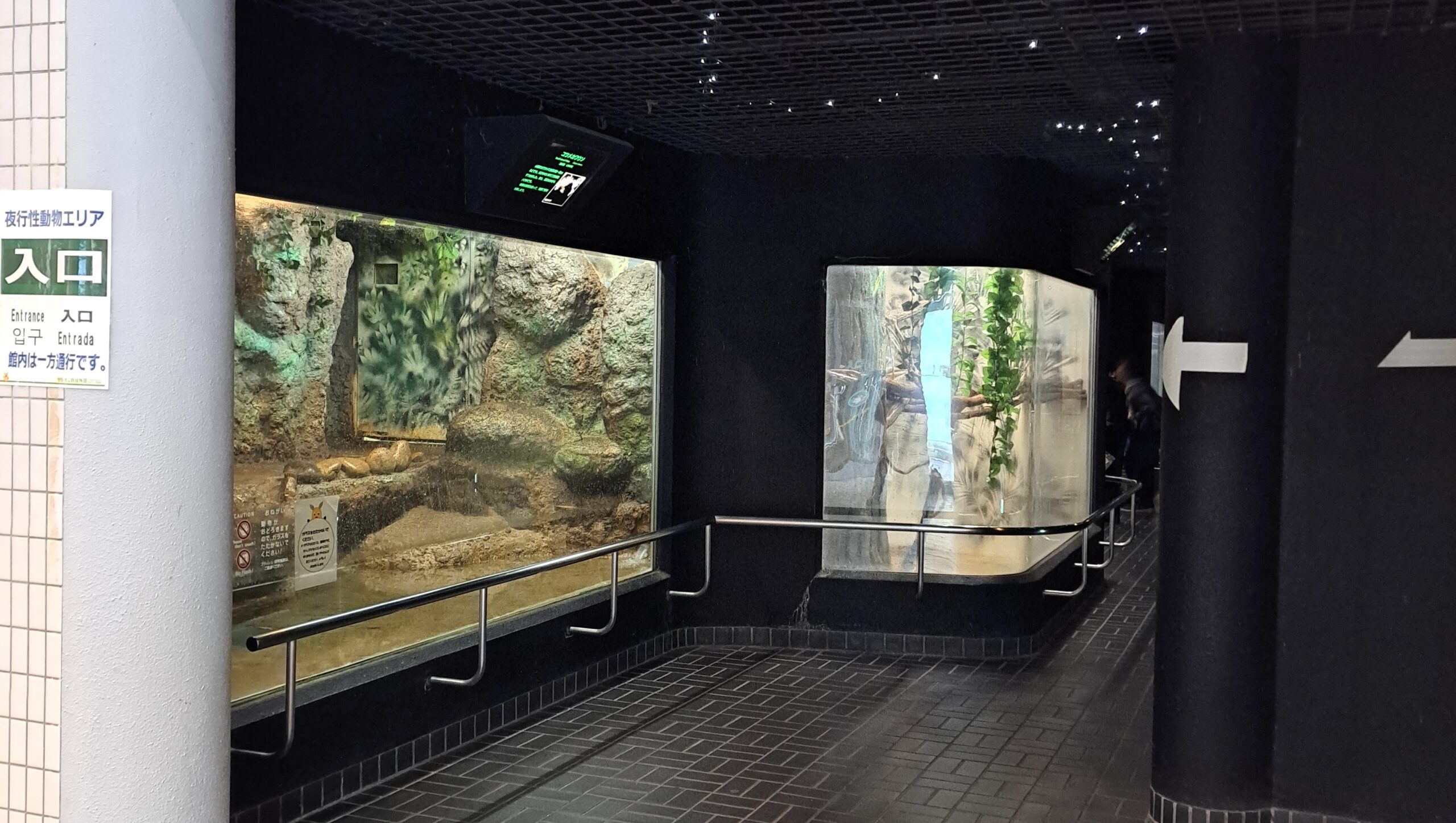 エリア外から撮影したので写真では分かりにくいですが、中は暖色灯が多少灯っている程度の暗いエリアで、夜行性の動物が活動する環境が再現されています。