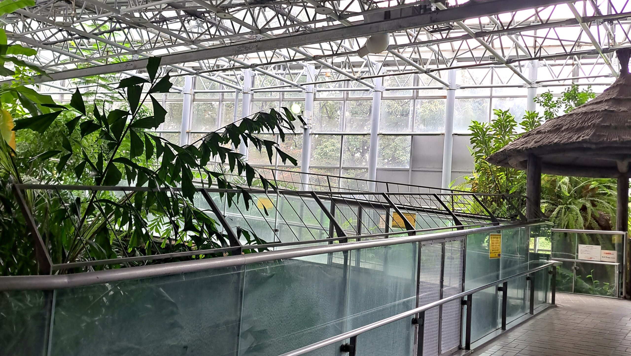 順路通り進んで1階スロープを登ると、1階にいるワニやリクガメを上から見下ろせる2階の温室へと入ります。