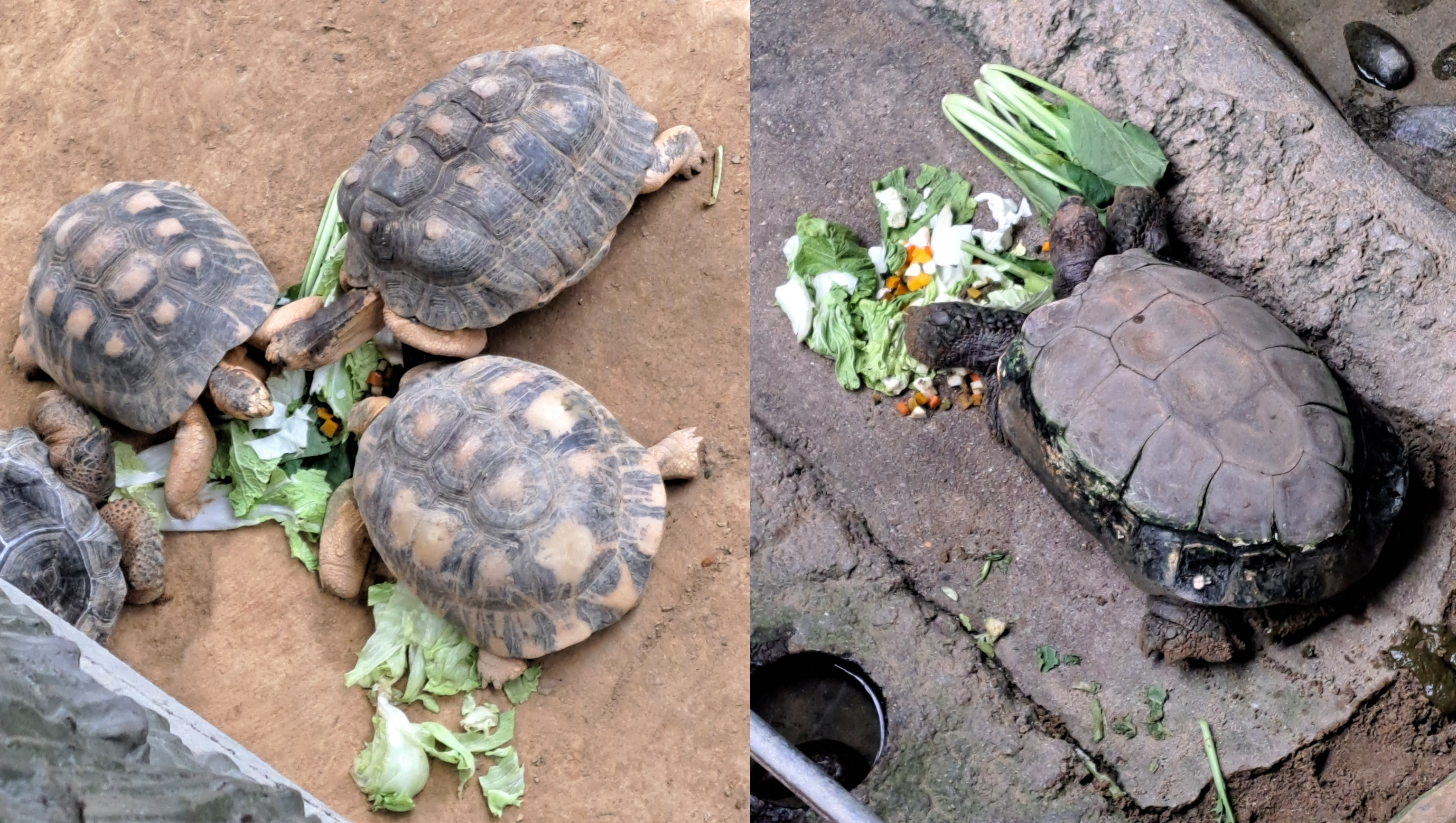 タイミングが合えばエサに群がるリクガメ達が見られます。野菜中心の健康的な生活を送っています。