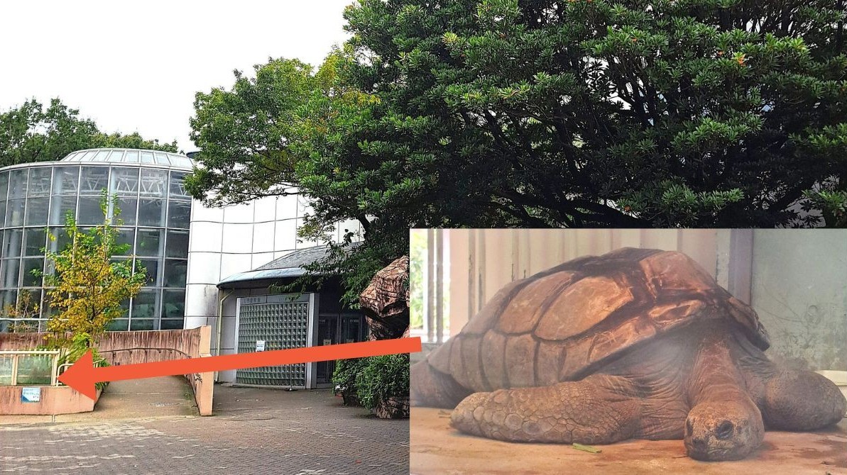 屋外展示として、館の入口に向かって左側の建屋には世界最大級のリクガメことアルダブラゾウガメが飼育されています。