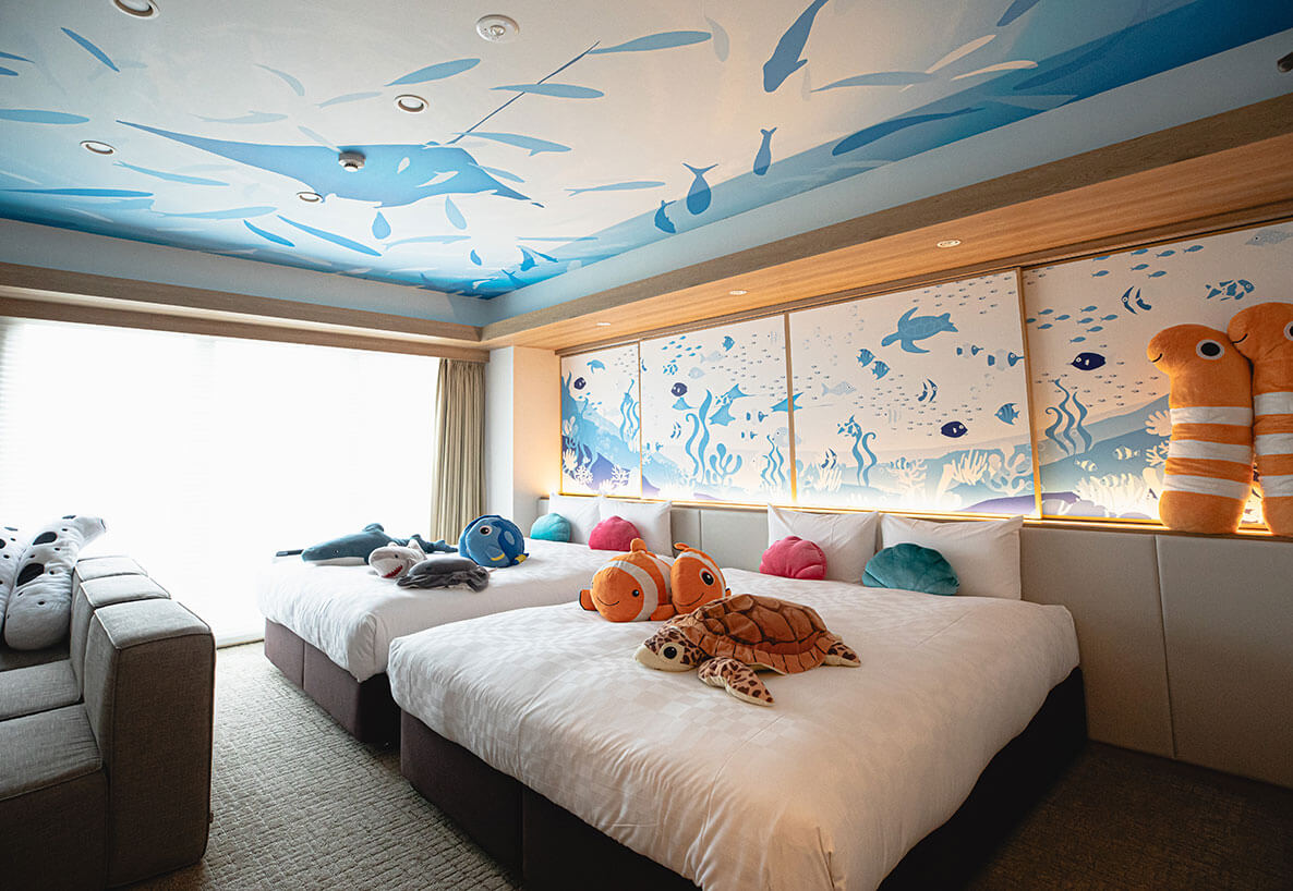エレベーターから降りた瞬間からまるで水族館の中に泊まるような気分!名古屋の人気スポット名古屋港水族館とコラボした様々な海の生き物に出会えるお部屋です。「赤道」「深海」「南極」をテーマにした3つの客室は、それぞれのエリアにいる海の生き物のぬいぐるみやイラストに囲まれたコンセプトルームです。